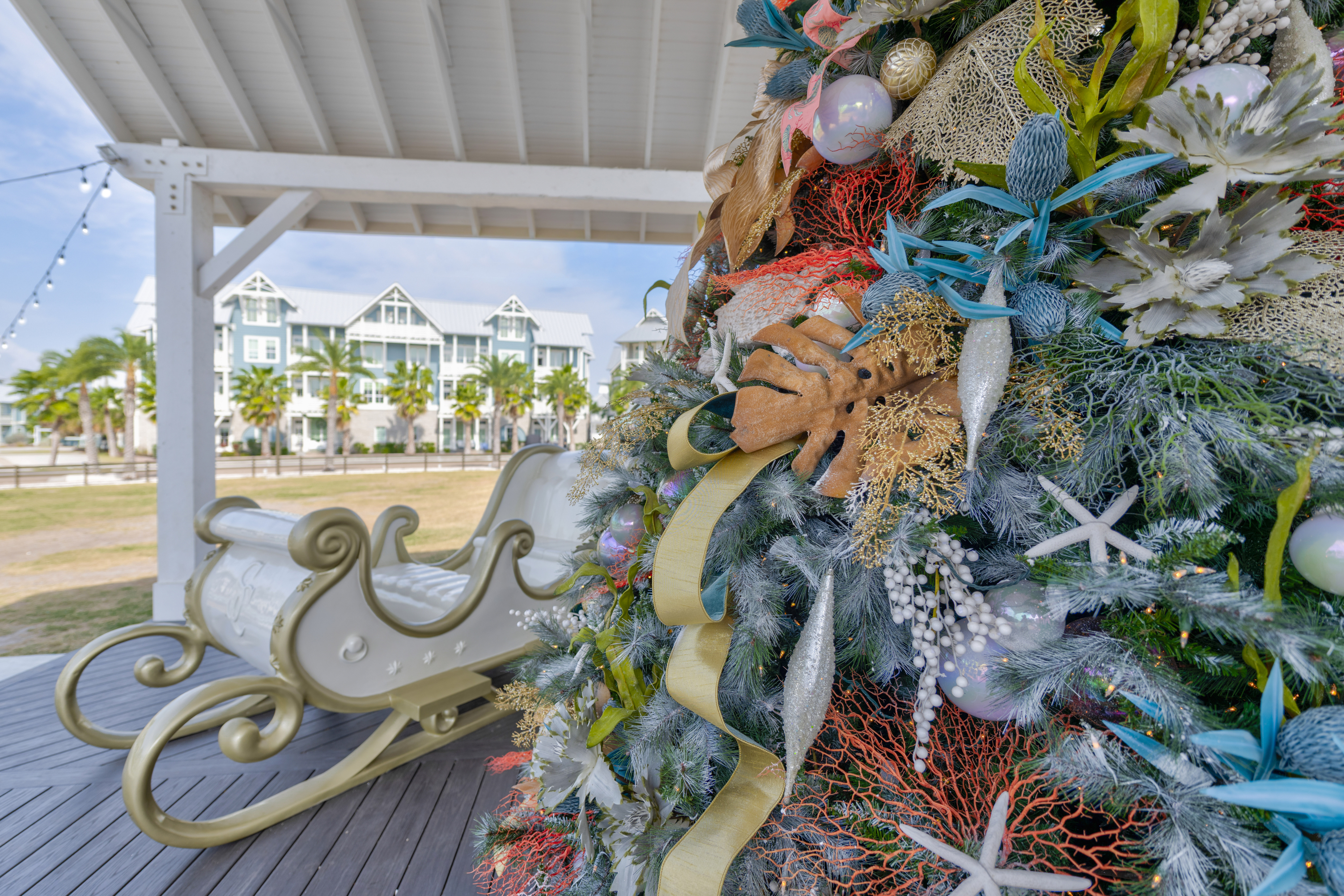 Shimmer at the Shore runs from Thanksgiving to New Year's, with our Town Center tree, lighted palms, and rental homes decorated for the holidays.
